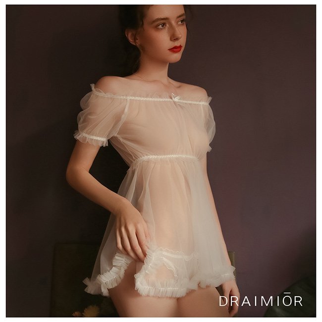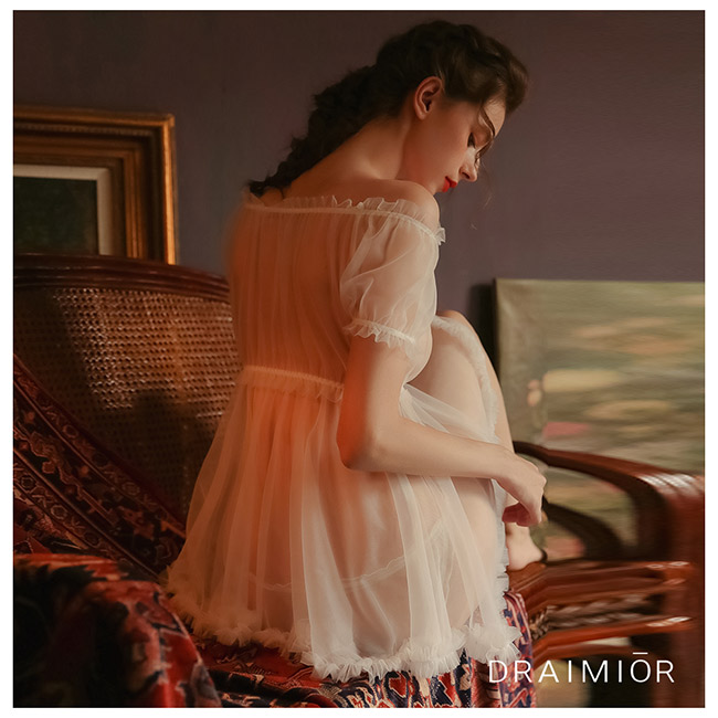 DRAIMIOR刺繍レースべビードール Tバック付き 2点セット。ホワイト(WHITE)