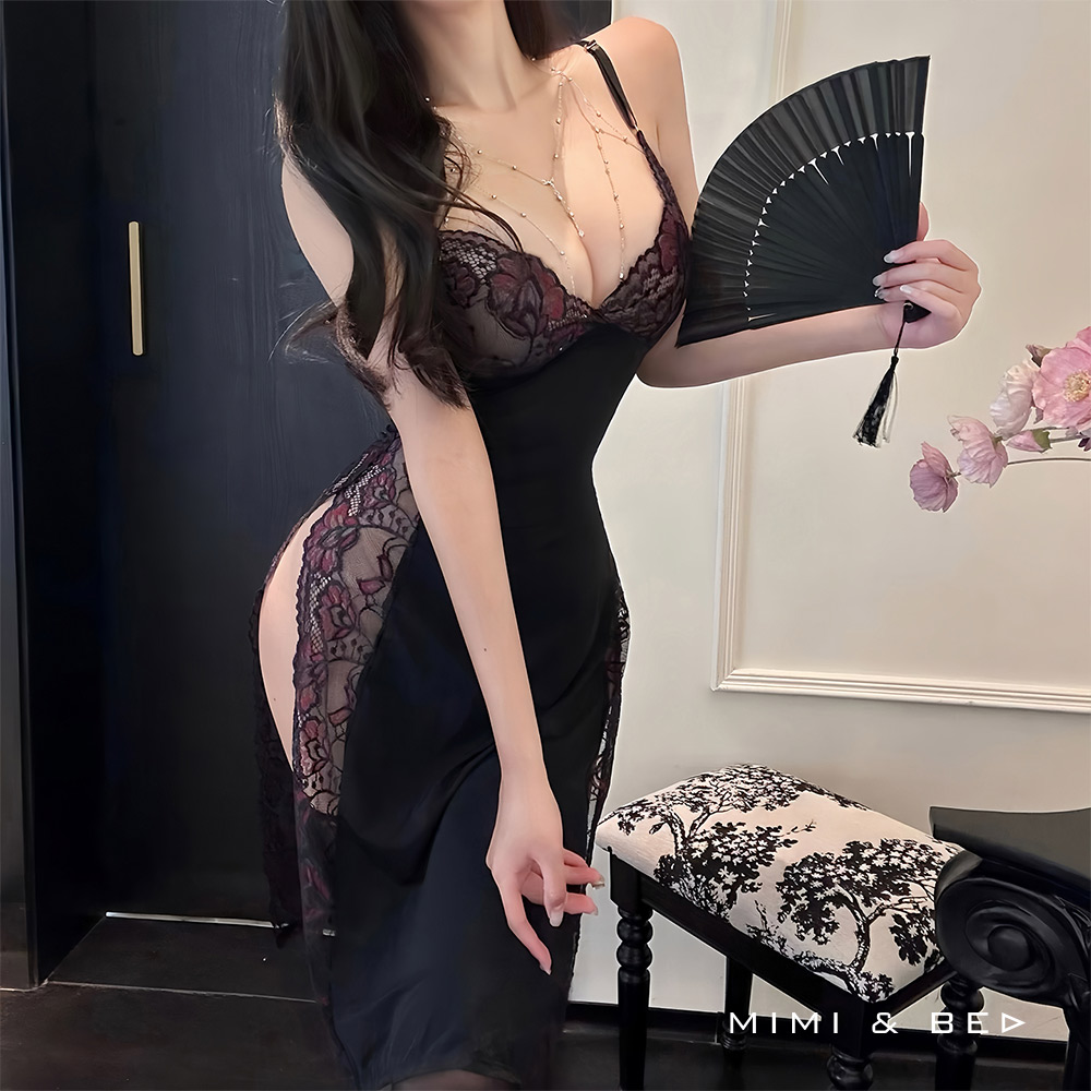 優雅深V側邊鏤空高開叉長旗袍。2色 MIMIBED