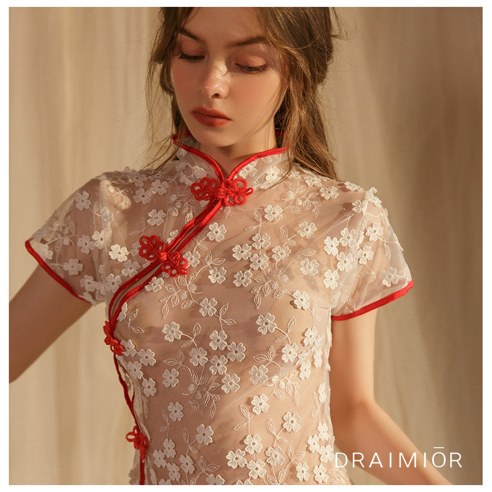 ウメ刺繍シースルーチャイナドレス。ホワイト(WHITE) DRAIMIOR
