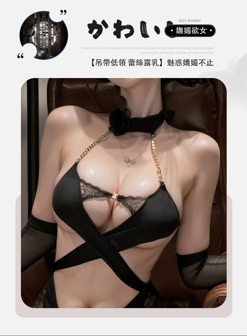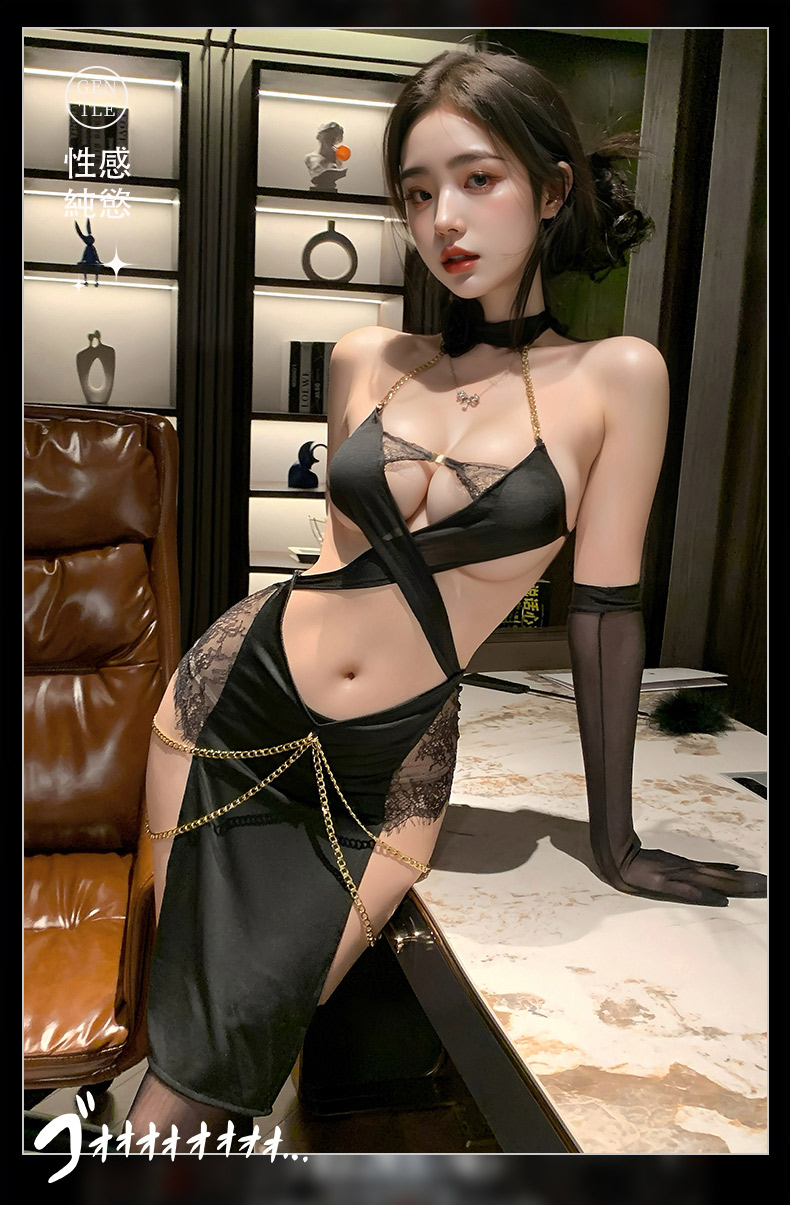 商品名:暗夜の女王 誘惑クロスホルターネック スリット入り チェーン装飾 美背ワンピース