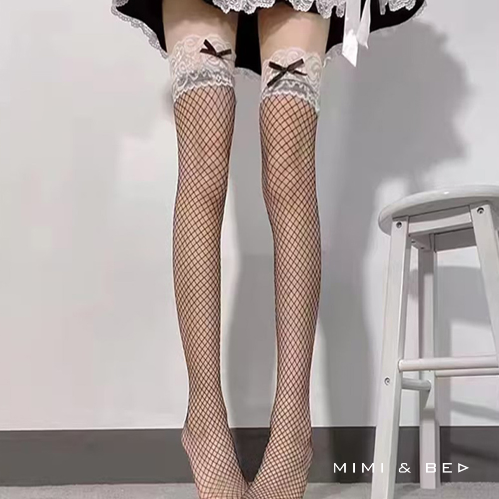 甜美寬蕾絲蝴蝶結大腿網襪。白色 MIMIBED個