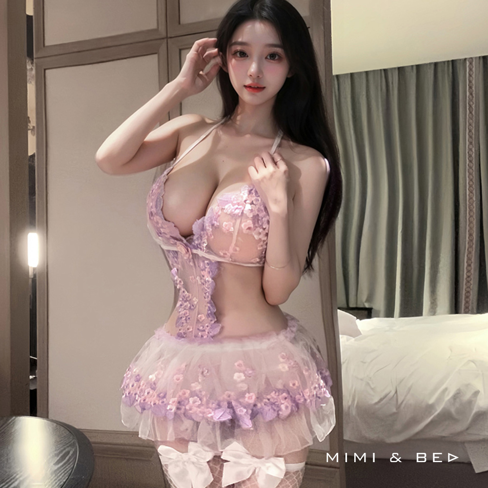 花漾微醺。立體蕾絲花瓣性感美背連身蓬蓬裙。2色 MIMIBED