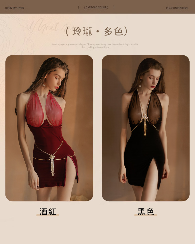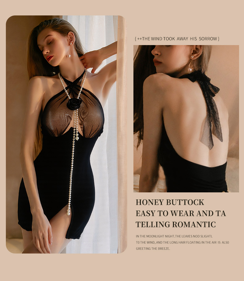 商品名:艶麗風情 シースルー ホルターネック サイドスリット ベロア サスペンダーワンピース(全2色)