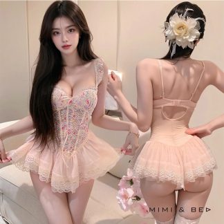 被窩的秘密 甜美教主蕾絲綁帶連體衣。粉色