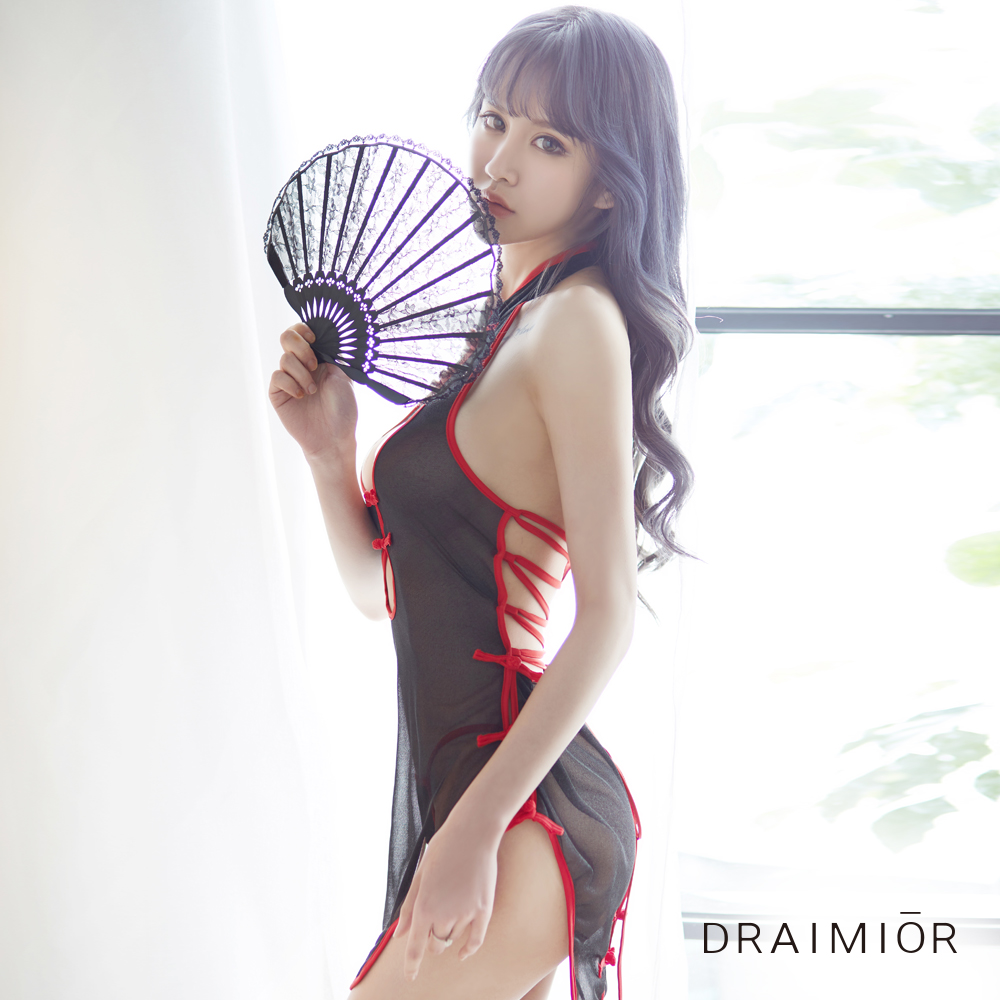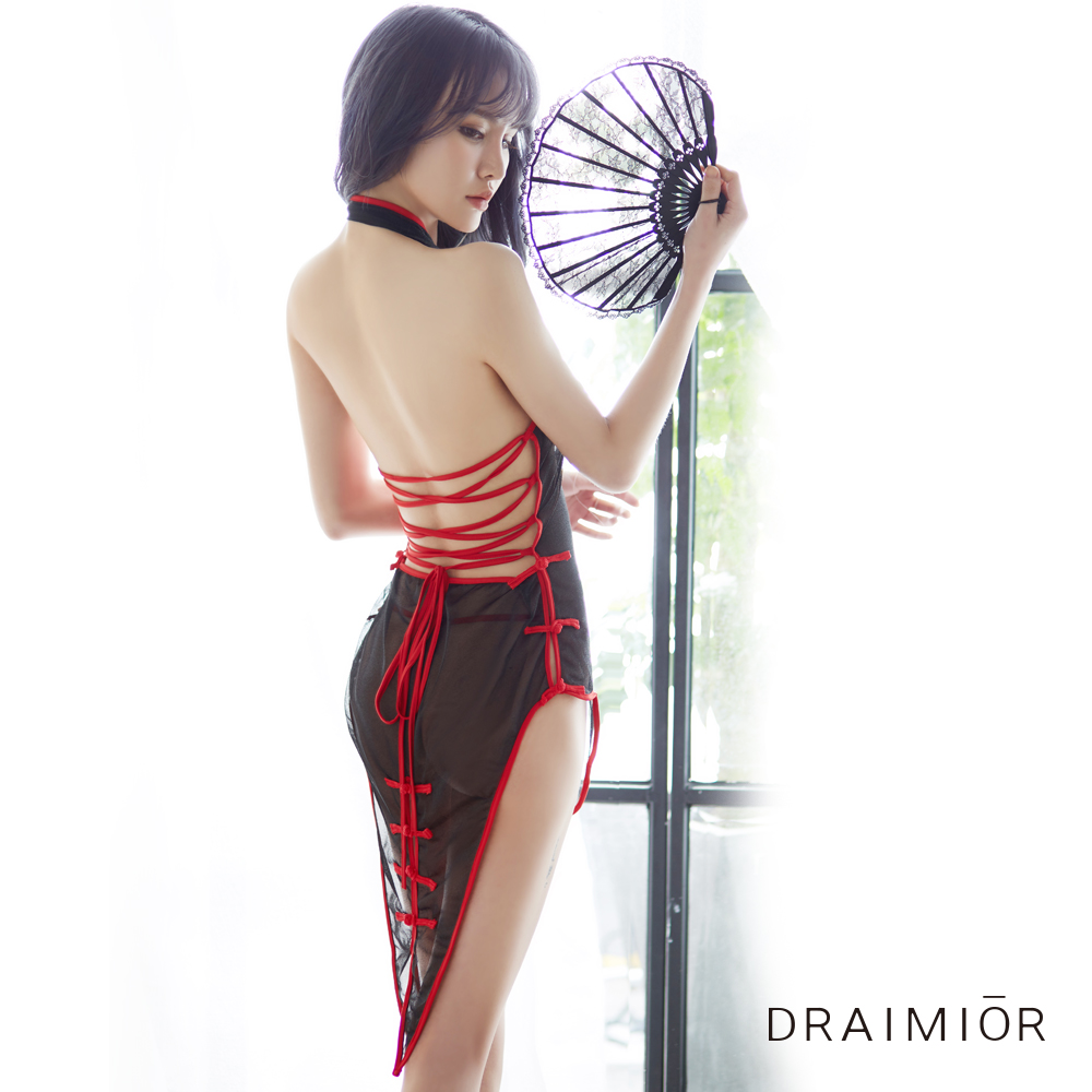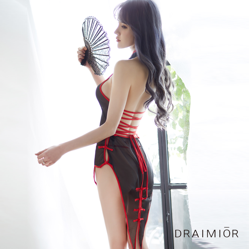 - 美腰挖空鏤空露背 性感透紗牽繫紅色綁繩
