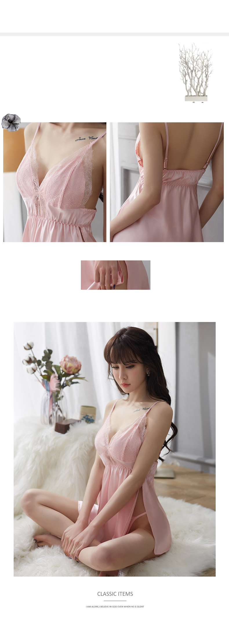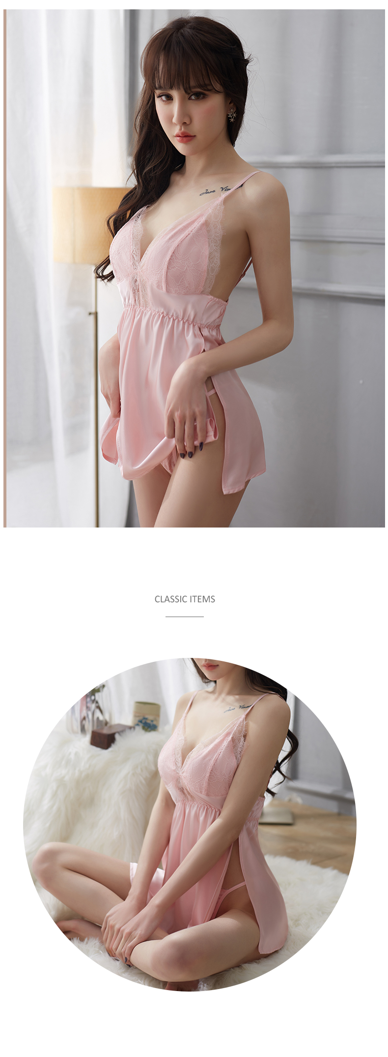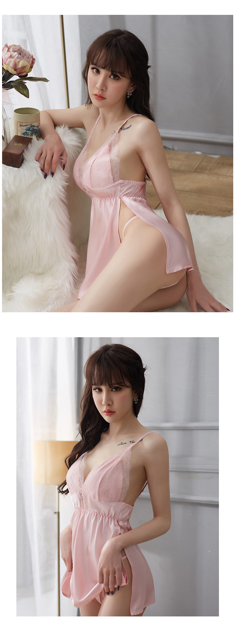 久慕雅黛 睫毛蕾絲絲滑側開叉短裙睡衣。粉色