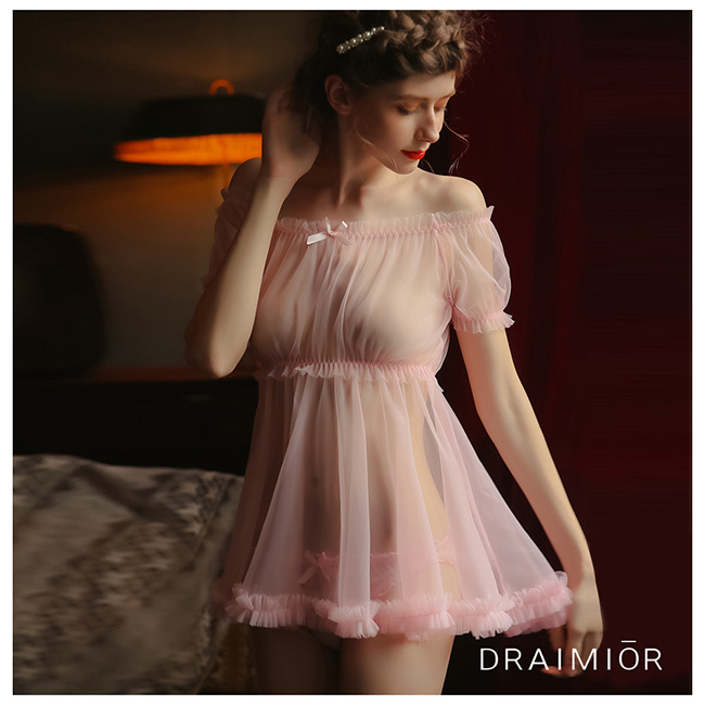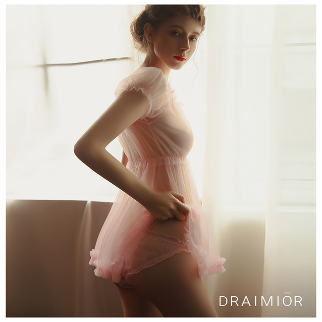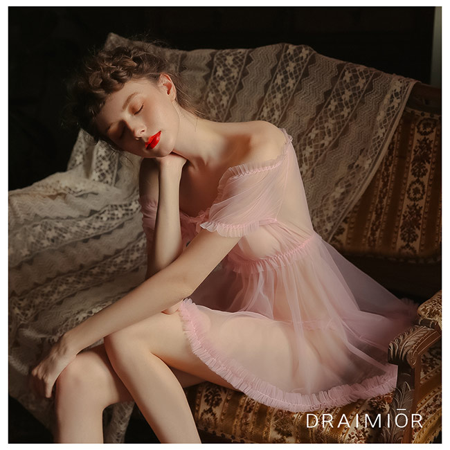 久慕雅黛 DRAIMIOR絲絨柔紗一字領短裙睡衣。粉色