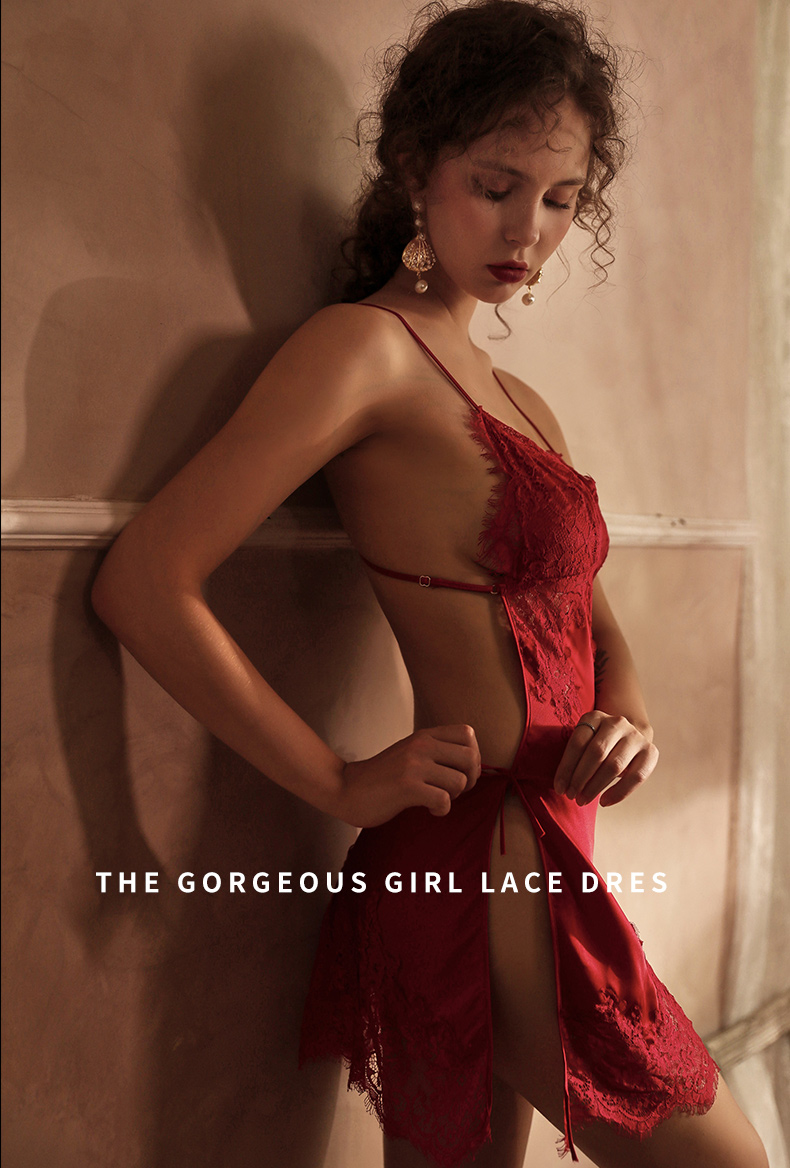 - 花朵蕾絲疊加花紋 蕾絲環繞美胸花邊裙擺