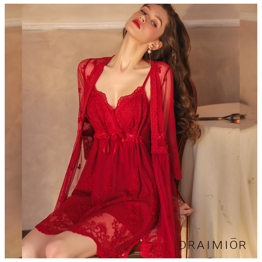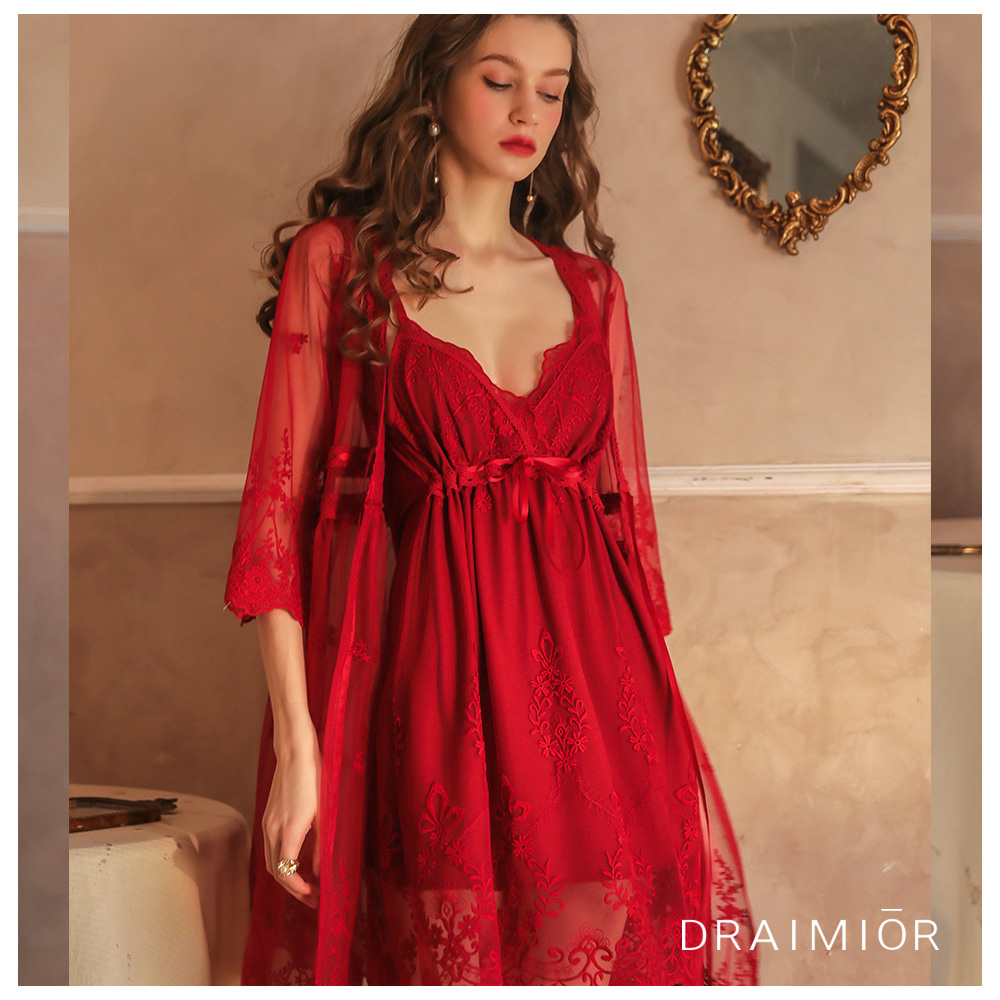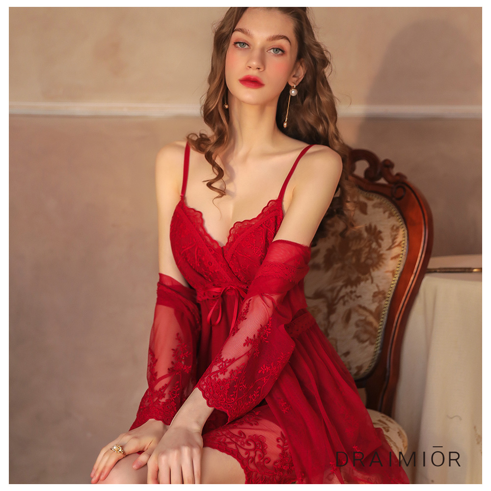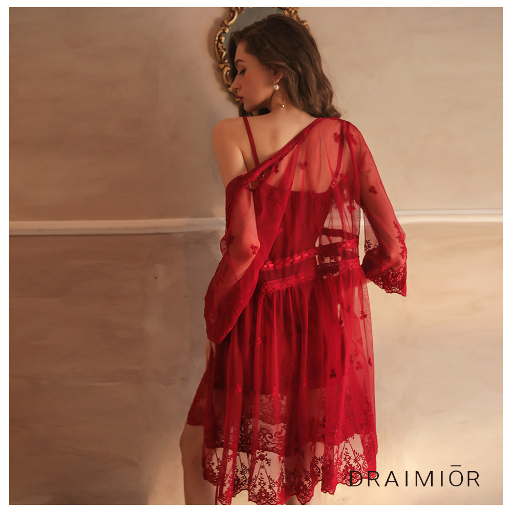 - 柔軟蕾絲輕薄外套 搭配花紋蕾絲柔紗睡衣