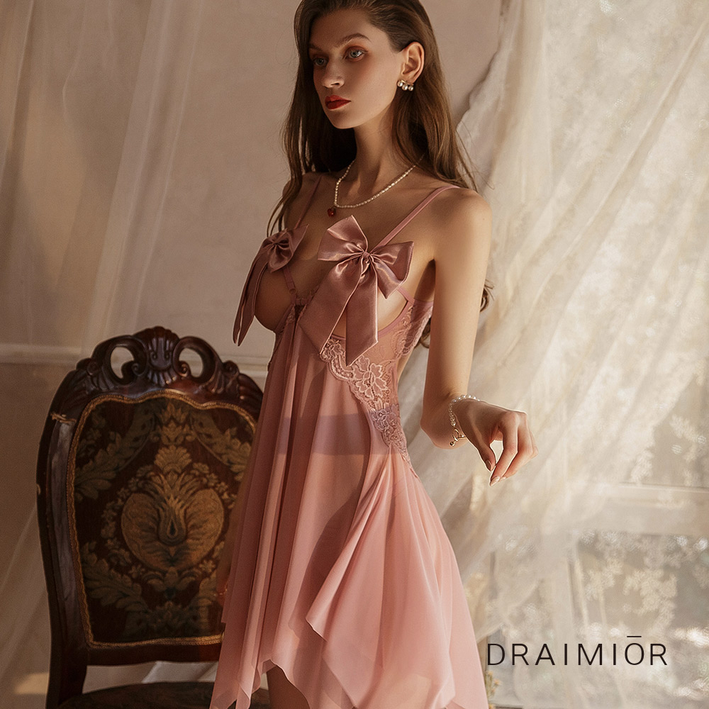 蝴蝶結絲帶前扣開叉柔紗睡裙。杏色 久慕雅黛