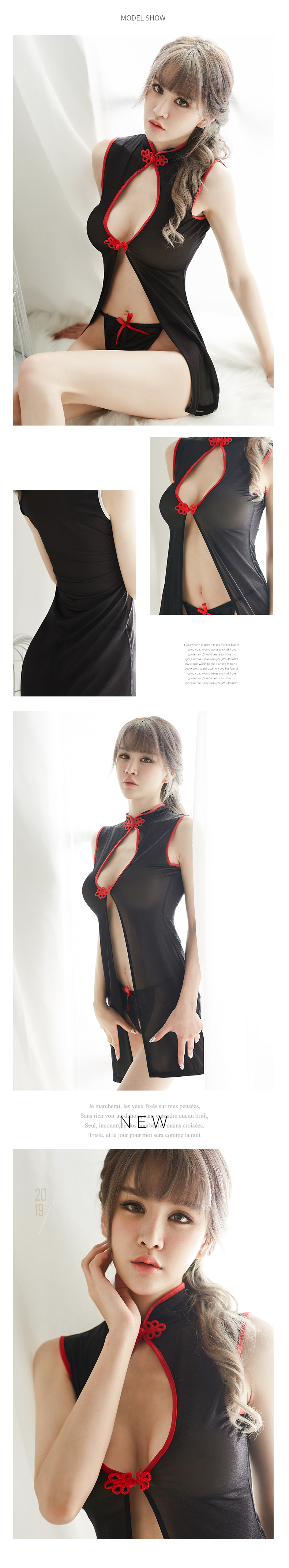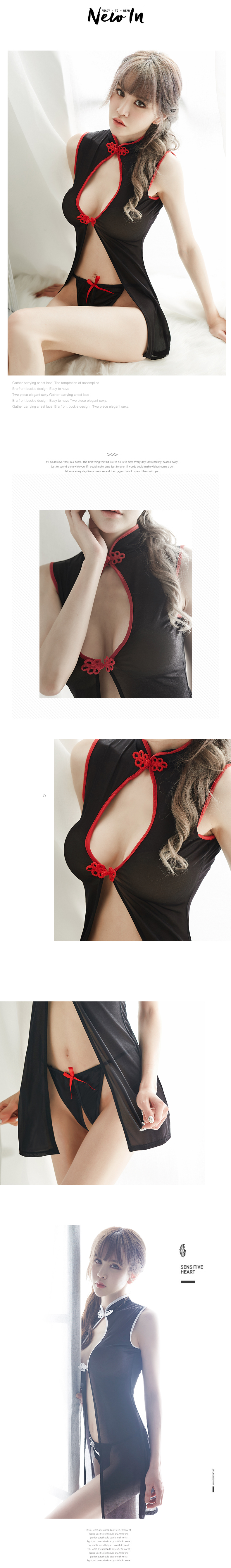 - 胸前挖空鏤空開叉 性感透紗牽繫古典盤扣