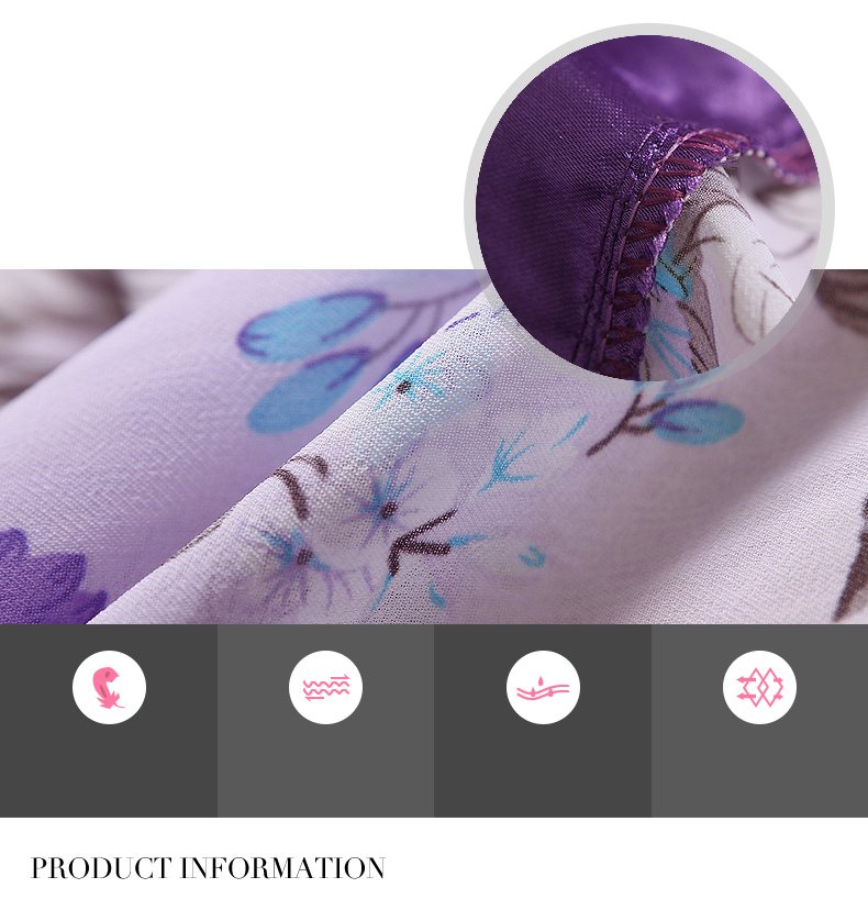 - 紫色華麗光澤感的緞面布料搭配飄逸的印花雪紡
