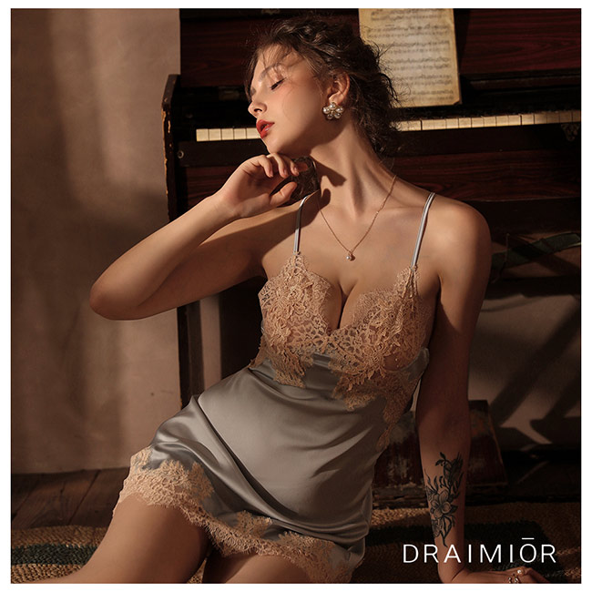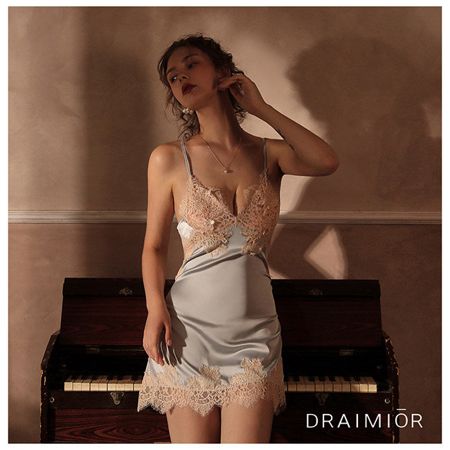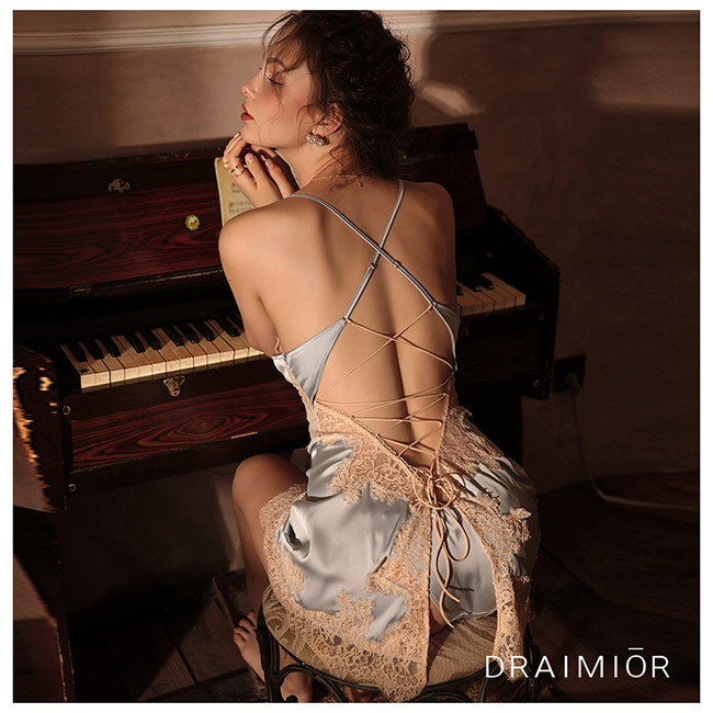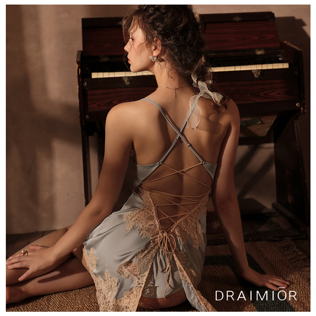 久慕雅黛 DRAIMIOR法國女伶蕾絲綁帶後開叉睡裙。藍色