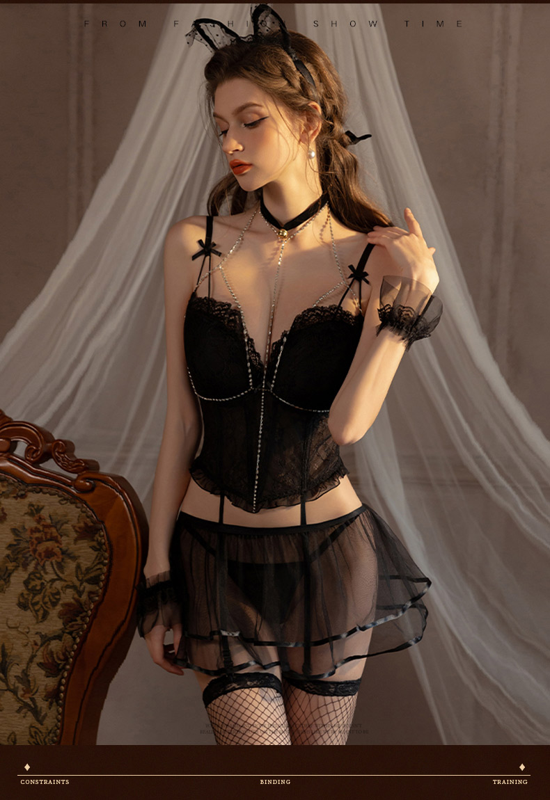 內容物上衣+群子+吊襪帶 +T褲+鈴鐺頸飾+手環*2