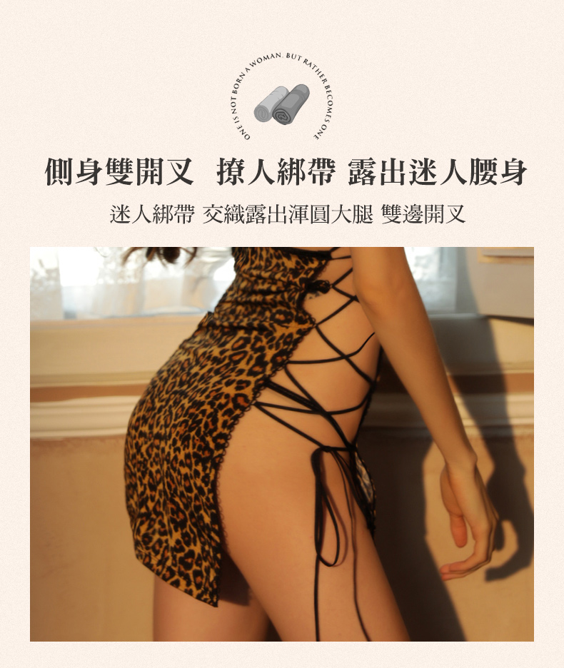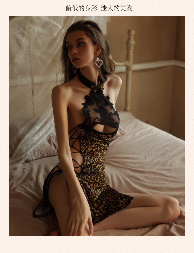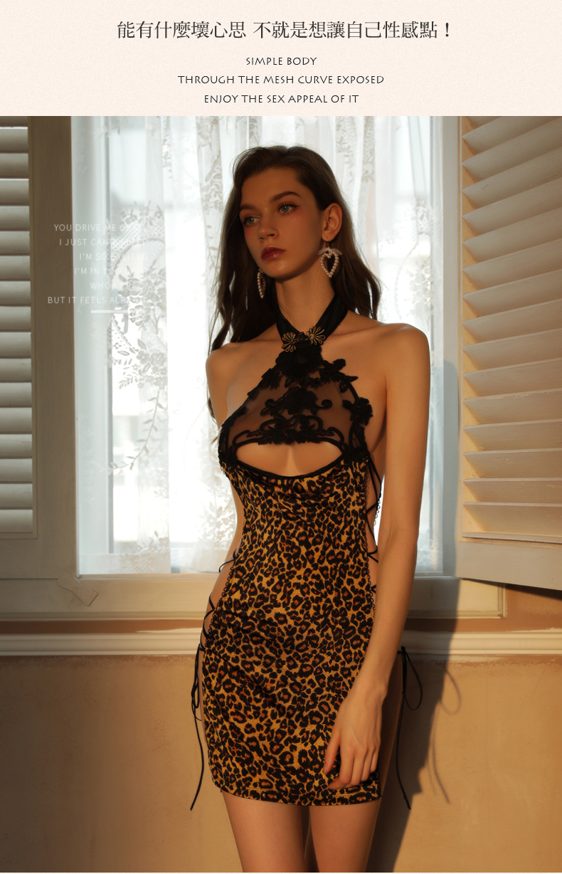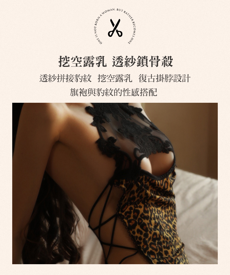 - 鏤空透紗拼接 野性豹紋與復古旗袍的混搭