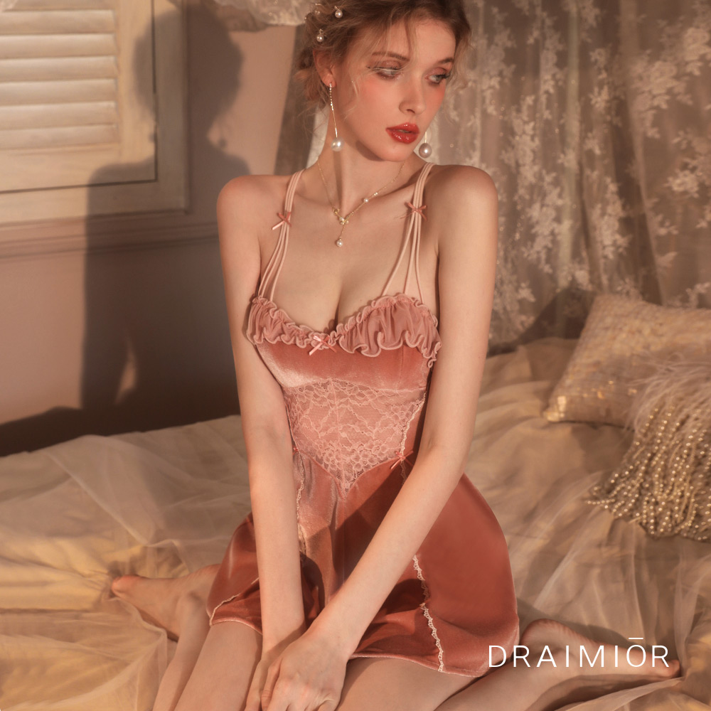 甜美花邊法式浪漫絲絨吊帶裙。粉色 久慕雅黛