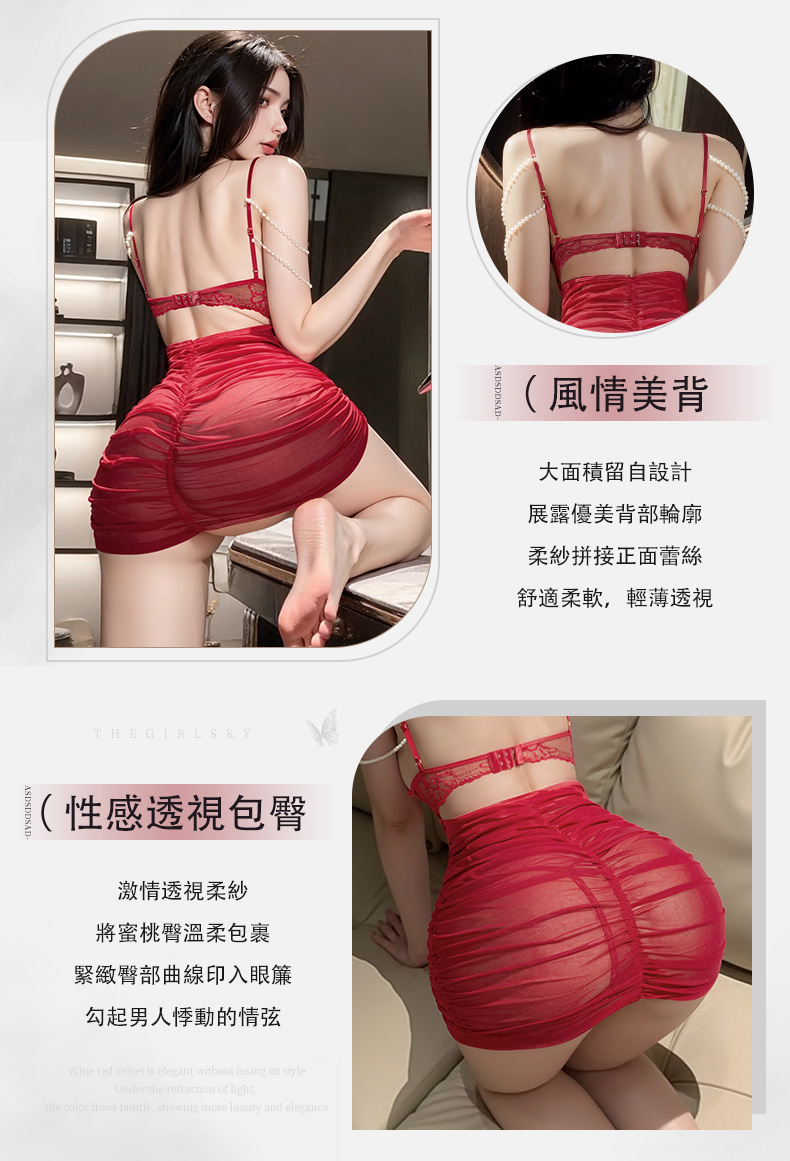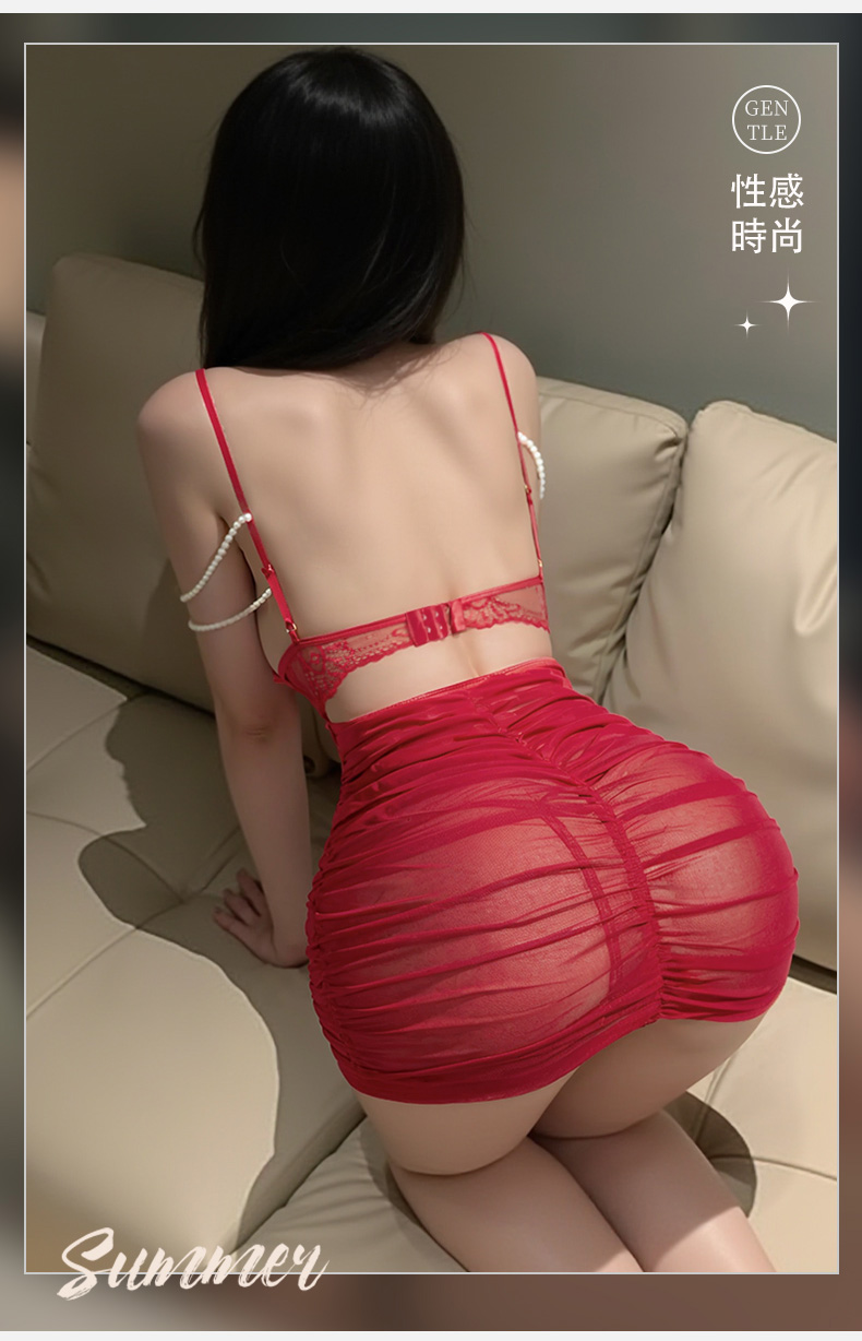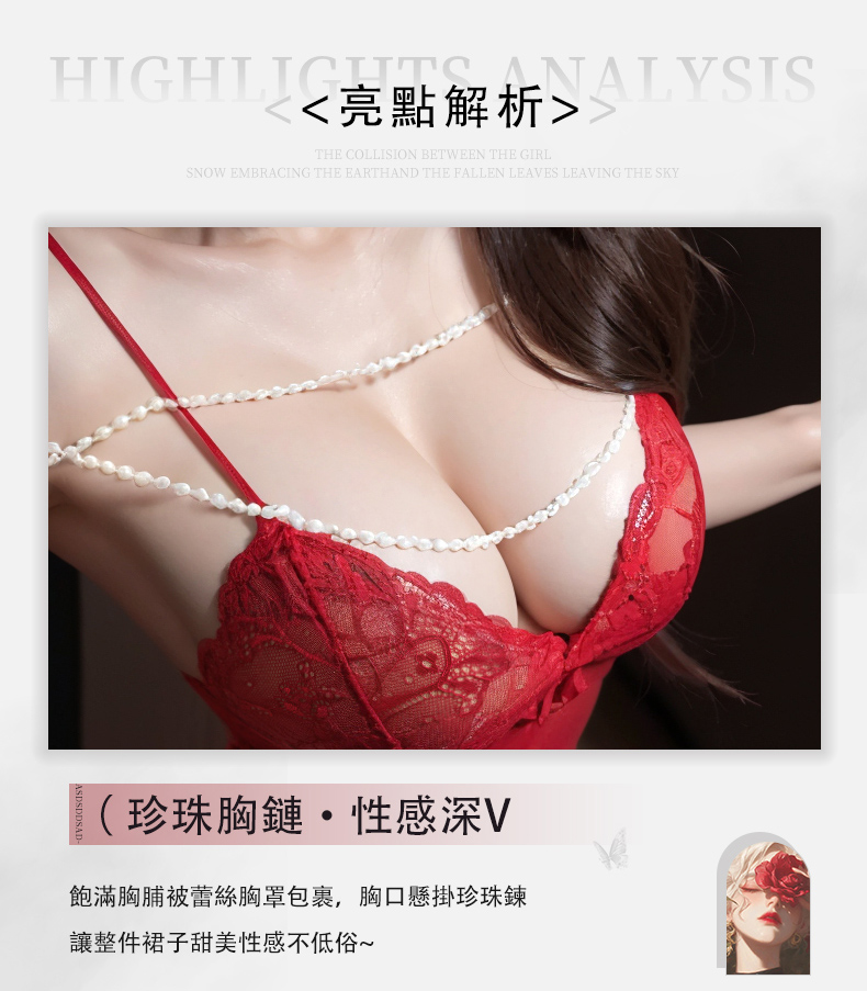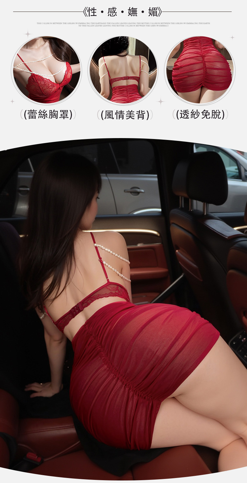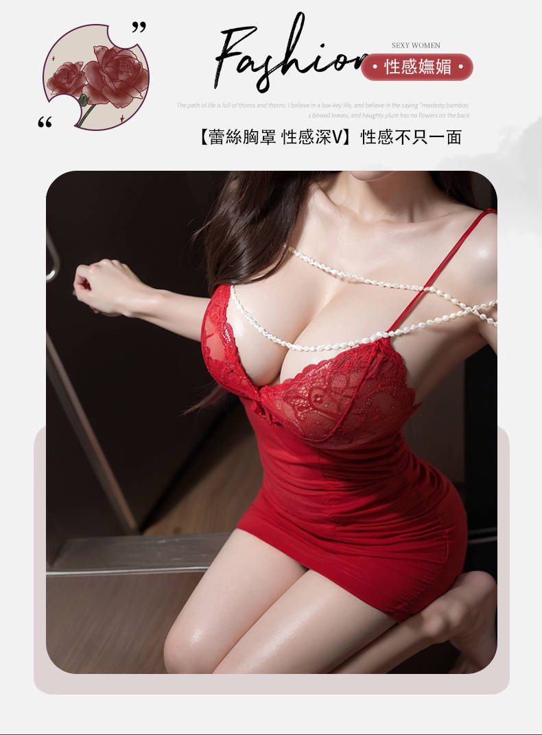 - 紅豔珠鍊 深V胸前蕾絲透視 突顯傲嬌身材