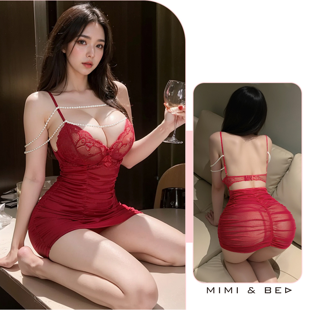 - 紅豔珠鍊 深V胸前蕾絲透視 突顯傲嬌身材
