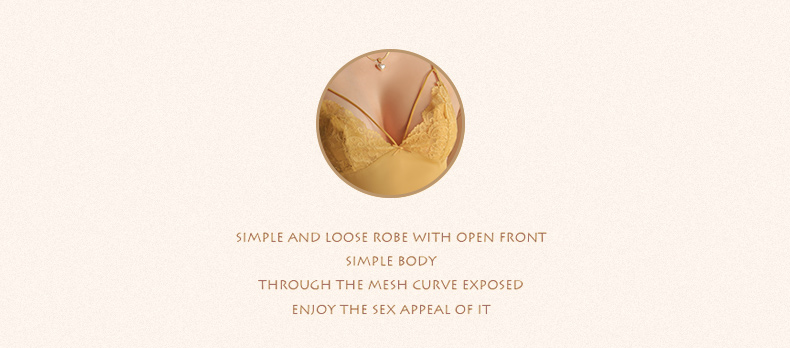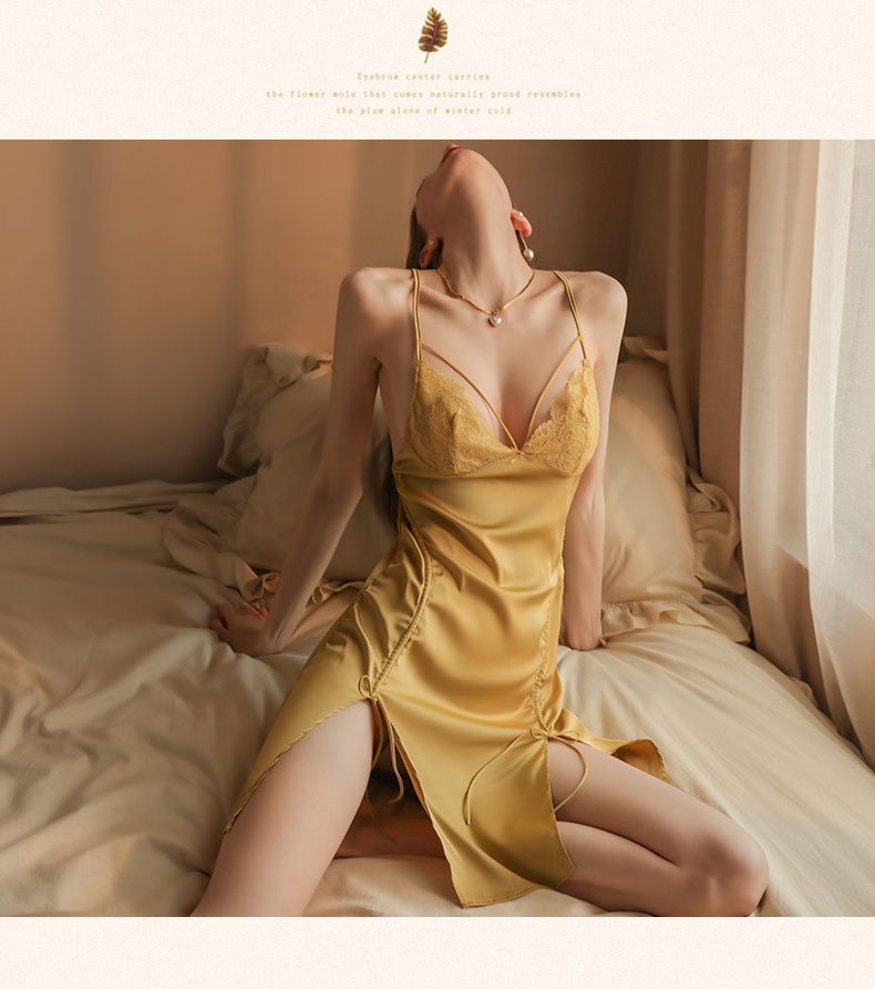 美胸蕾絲綁帶裙擺絲滑睡裙。黃色 DRAIMIOR