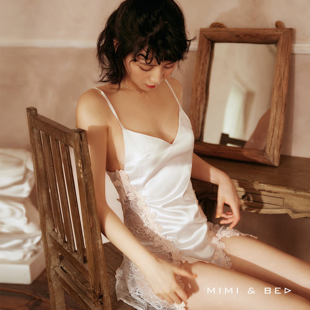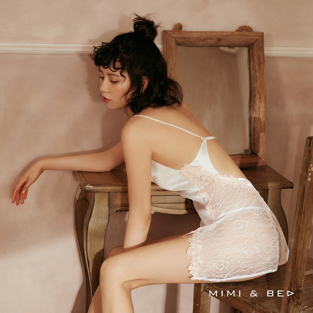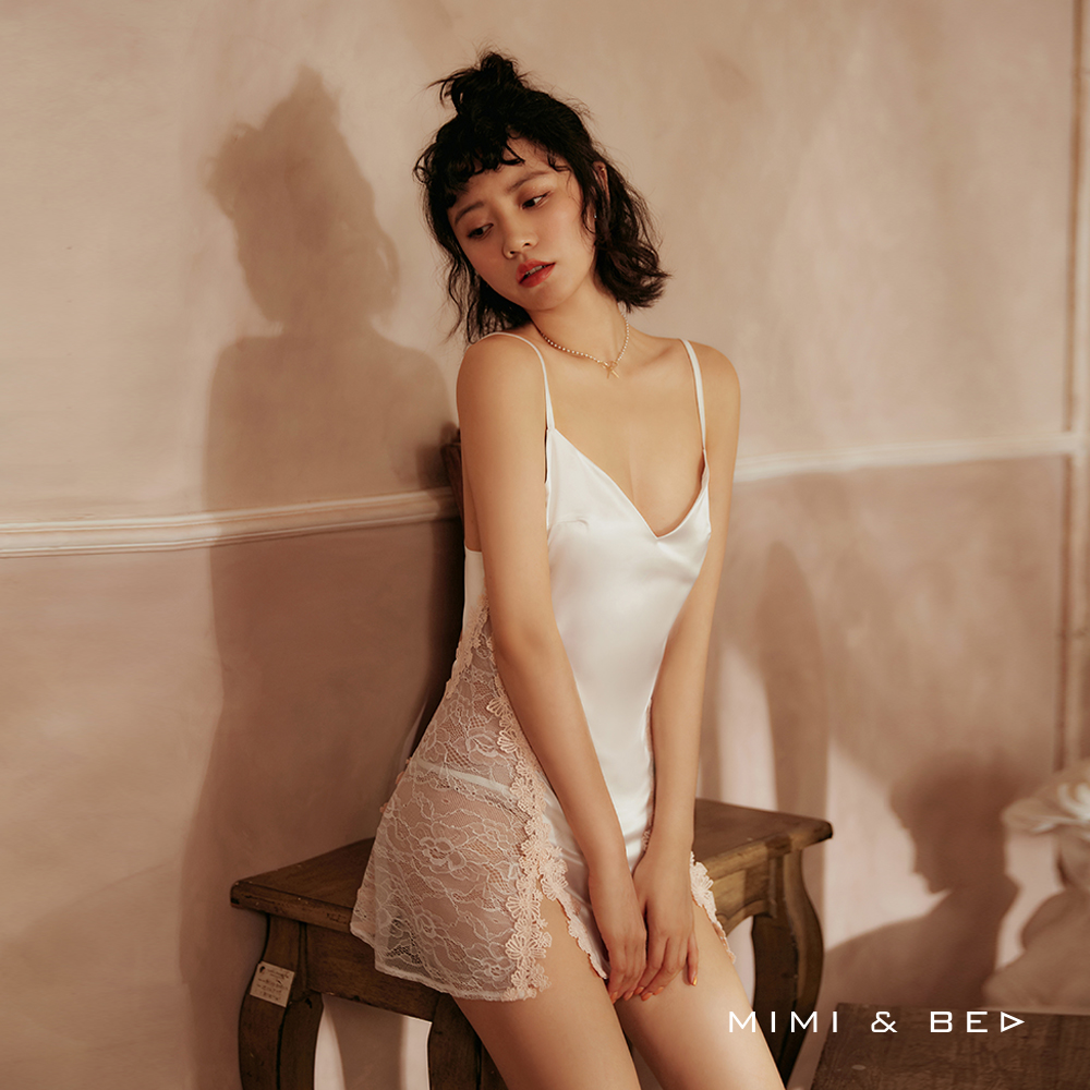 被窩的秘密 水溶花蕾絲雙開叉吊帶睡裙。白色