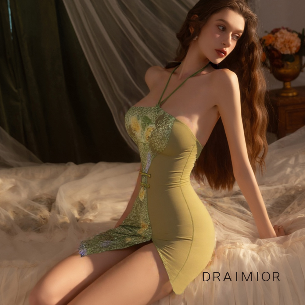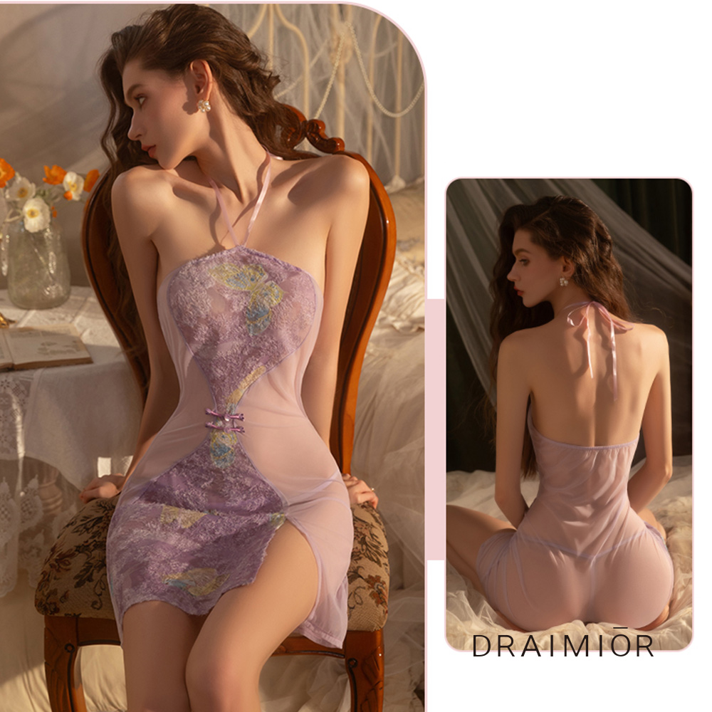 - 細緻透紗與胸前旗袍風設計的性感連身衣。