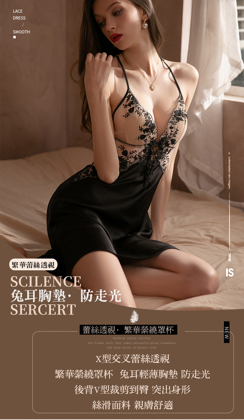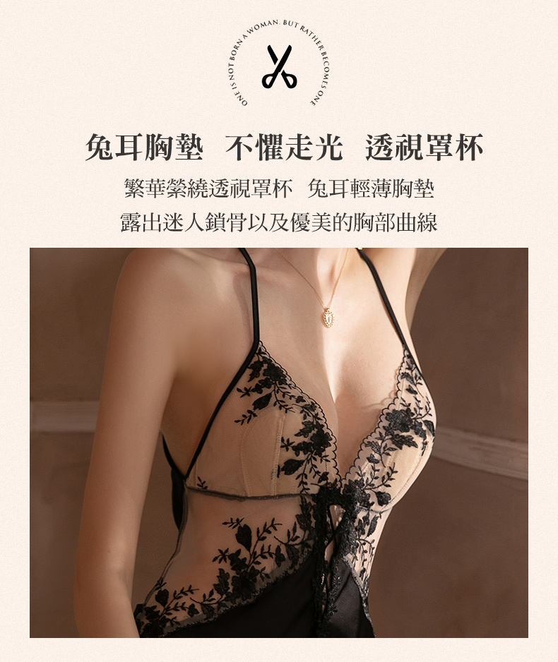 - 兩側美腰性感透紗 胸前蕾絲鏤空刺繡罩杯