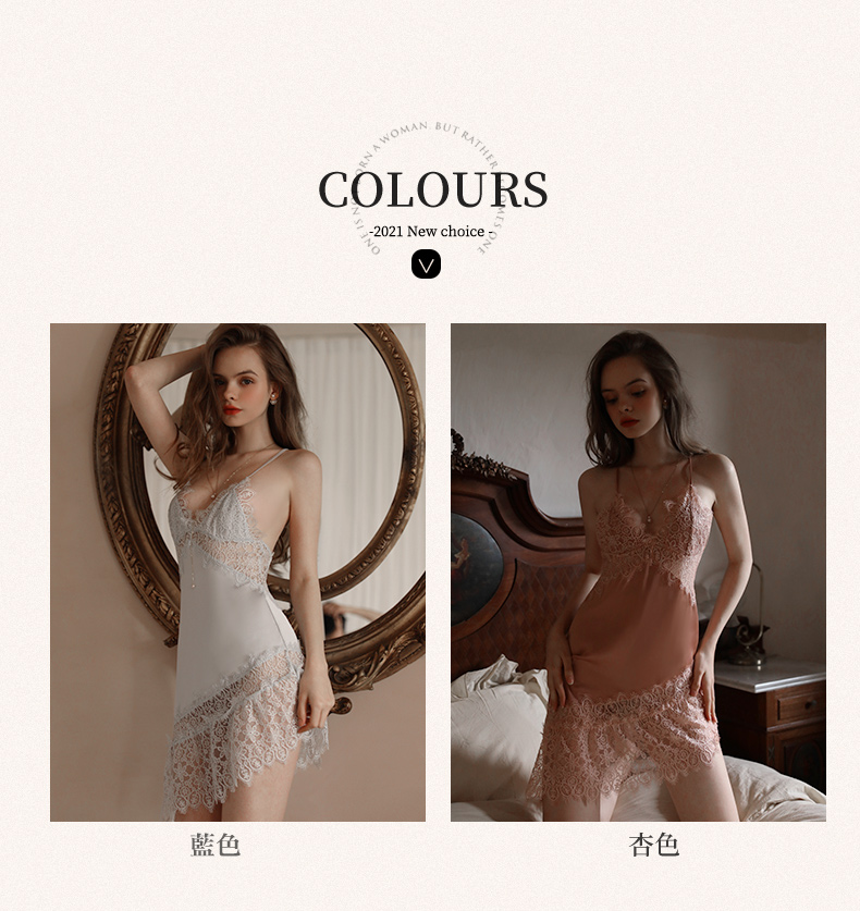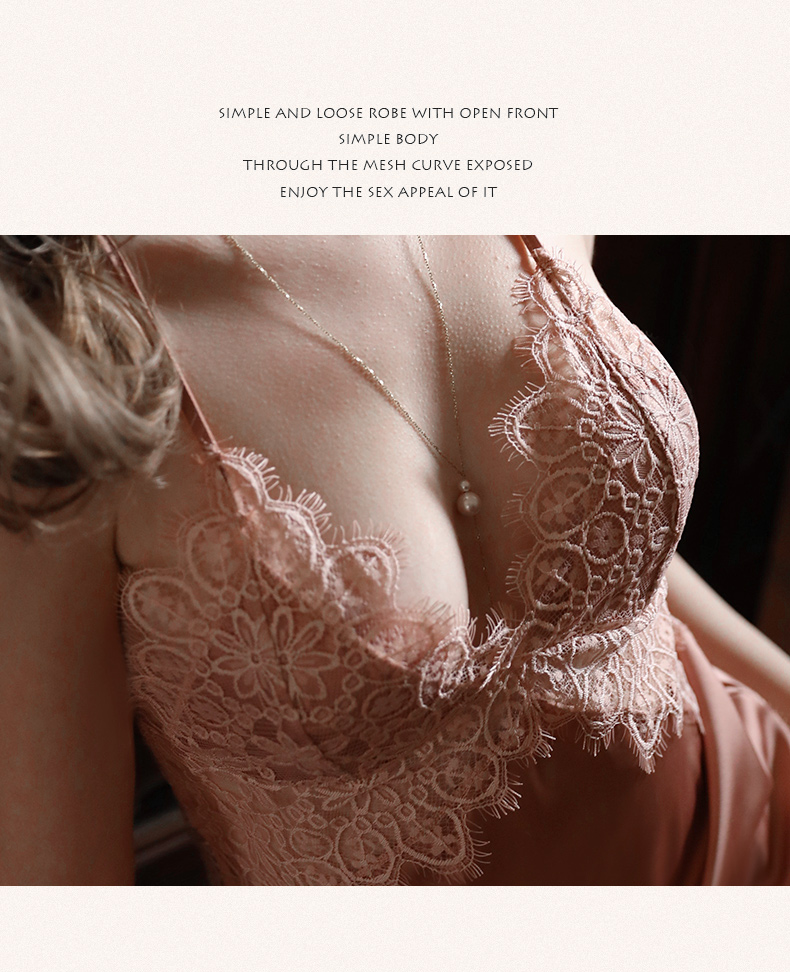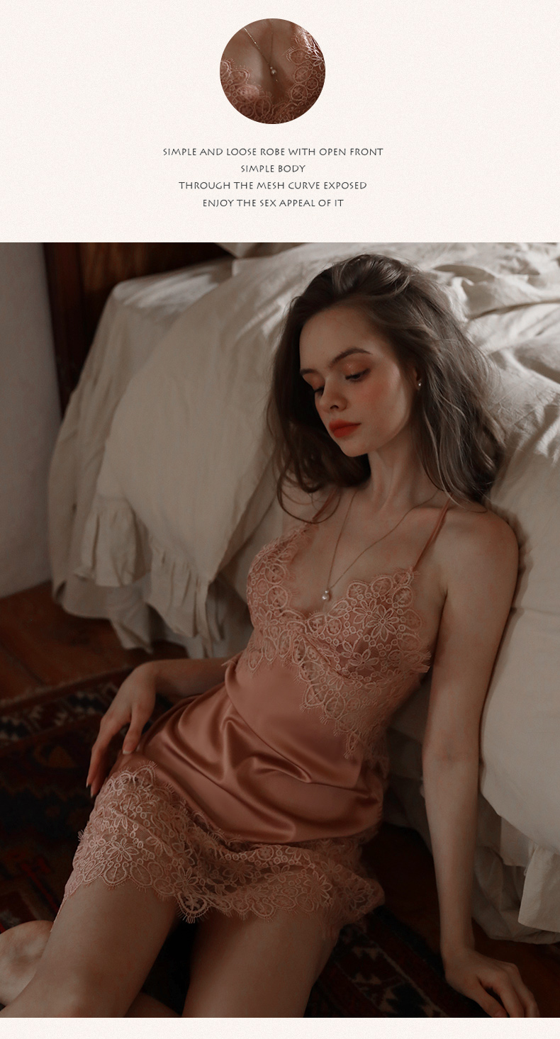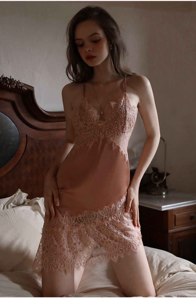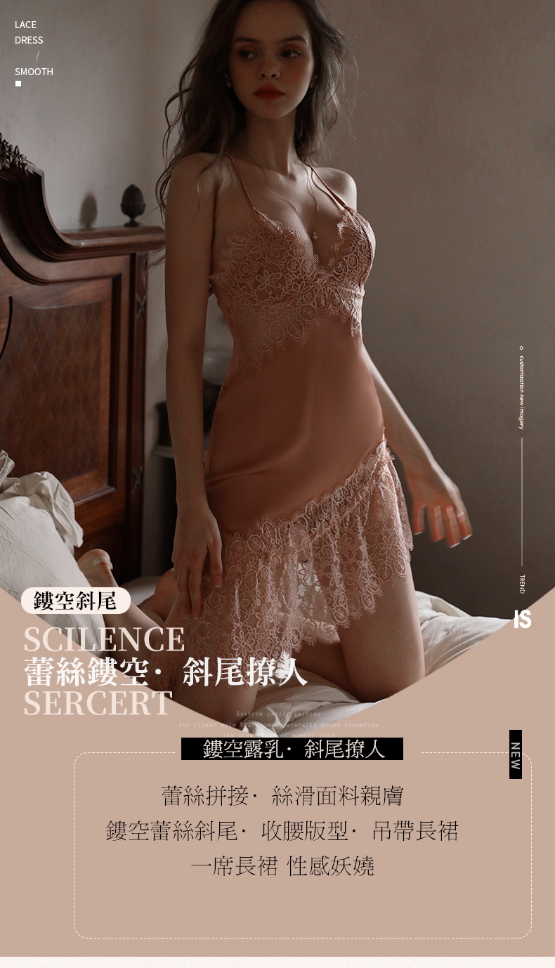 鏤空蕾絲斜尾絲滑吊帶睡裙。粉色 DRAIMIOR