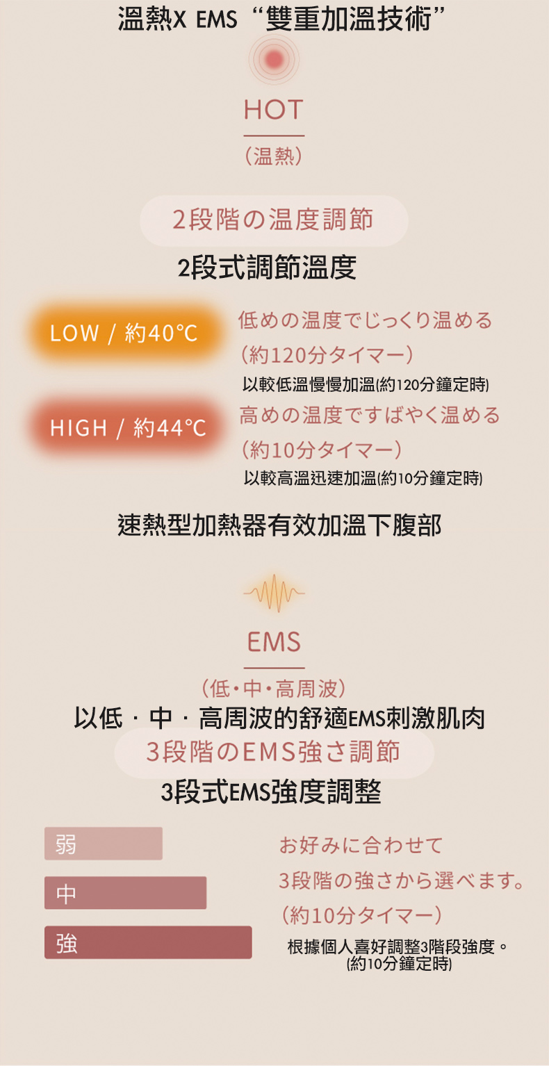 安全設定:低溫加熱約120分鐘、高溫加熱約10分鐘、EMS約10分鐘