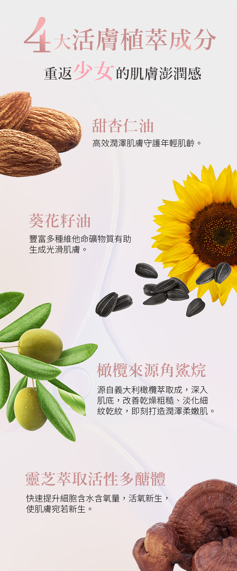 植萃專家提供全效修復肌膚、改善暗沉、重返原生肌膚的粉潤澎彈