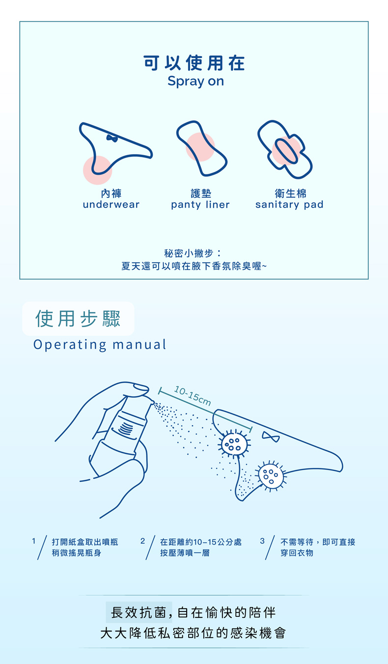 3.粉狀質地,保持內褲乾爽不濕黏,薄噴即可達到保護效果。