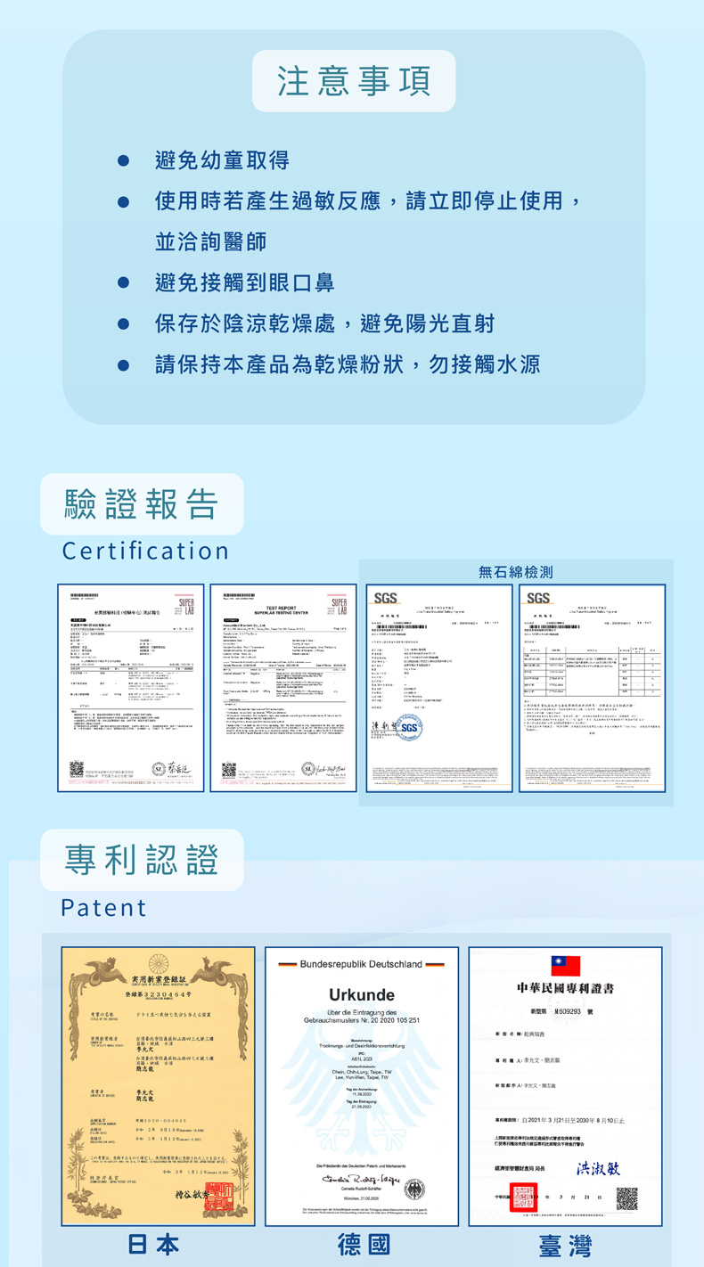 5.請保持本產品為乾燥粉狀,勿接觸水源