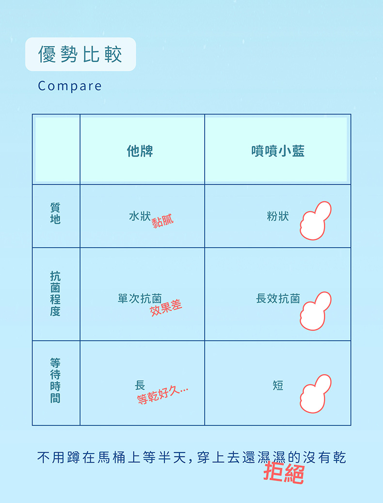 - 全球獨創乾粉抑菌設計,一秒快速形成保護層,超越液態商品