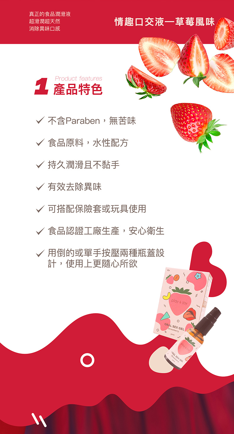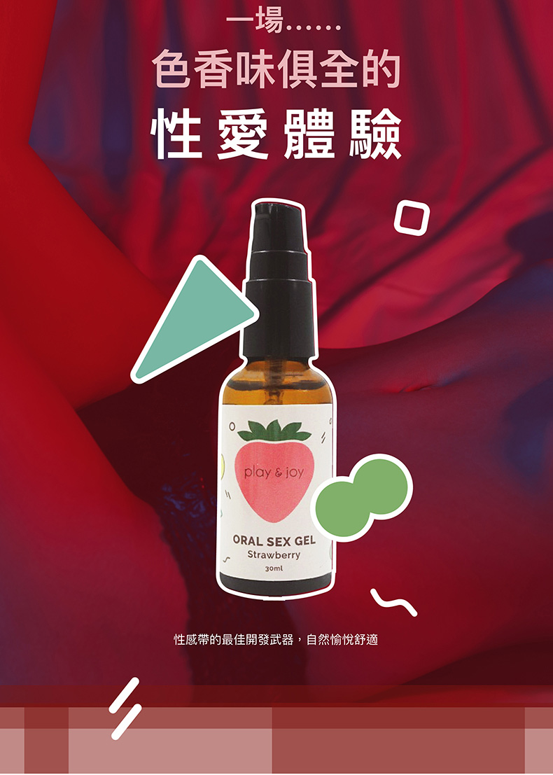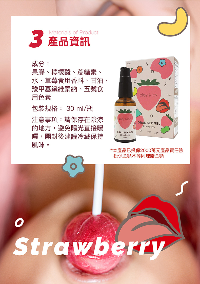 PLAY&JOY 運用食品材料在國際食品安全認證的工廠生產,製作出最安全的口交產品,讓兩性在互動的過程中,除了增加風味、情趣和潤滑之外,更多了味覺和嗅覺上的享受。